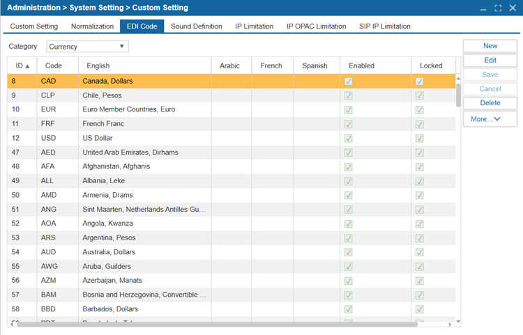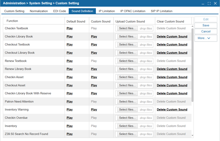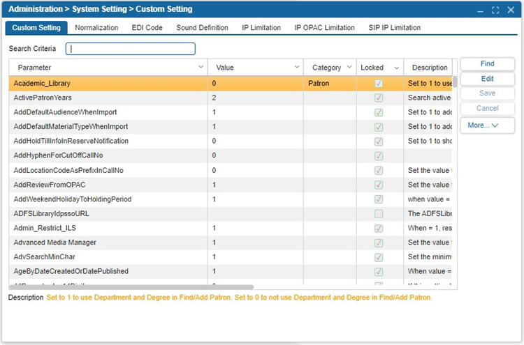 The Custom Setting feature is only available when logged in with Admin All. This window allows various windows to be customized (enabled or disabled) based on the library’s needs. Descriptions of the Custom Settings are provided at the lower of the window when the setting is selected.
