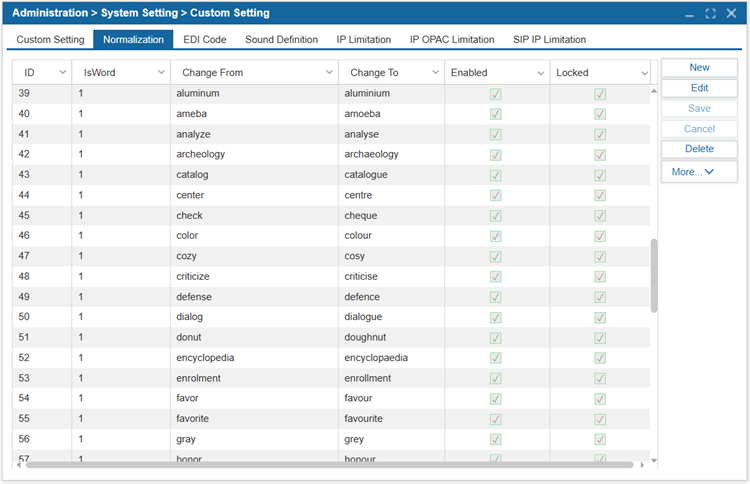 The Normalization feature allows automatic modification of specific characters and words when searching in the OPAC. This ensures consistency by standardizing spelling variations and replacing special characters.