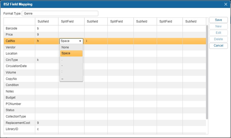 - Click on the Subfield or Splitfield and use the dropdowns to set what the system will gather from the copy information.