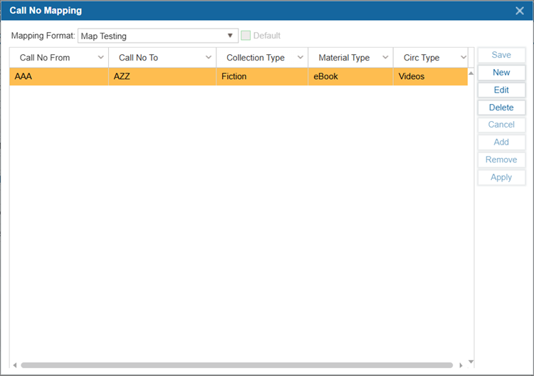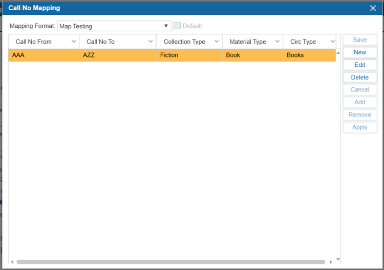 Call No Mapping adds predefined fields to new records cataloged in Basic Info based on the call number entered. This feature will only set fields in new item records manually created from Basic Info and will not affect records added through Z39.50.