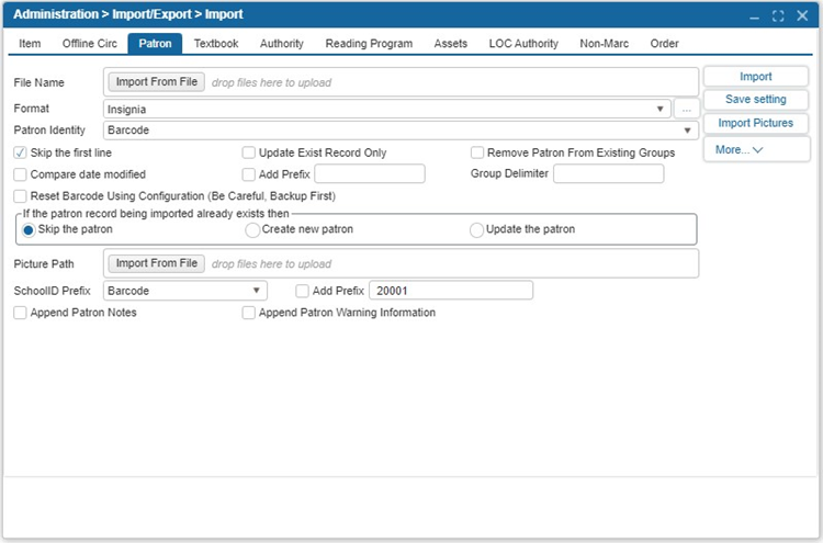Data can be imported into Insignia and exported from it through the Import, and Import Metadata, features. Patron data can be imported from another system or added manually. Item records can be imported from a MARC file.