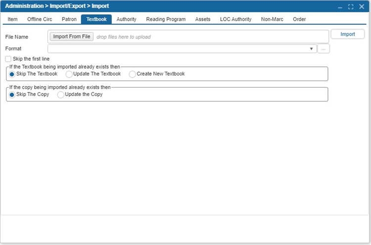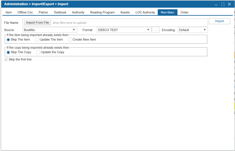 - Select Administration > Import/Export > Import > Non-MARC tab.