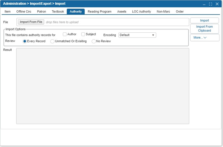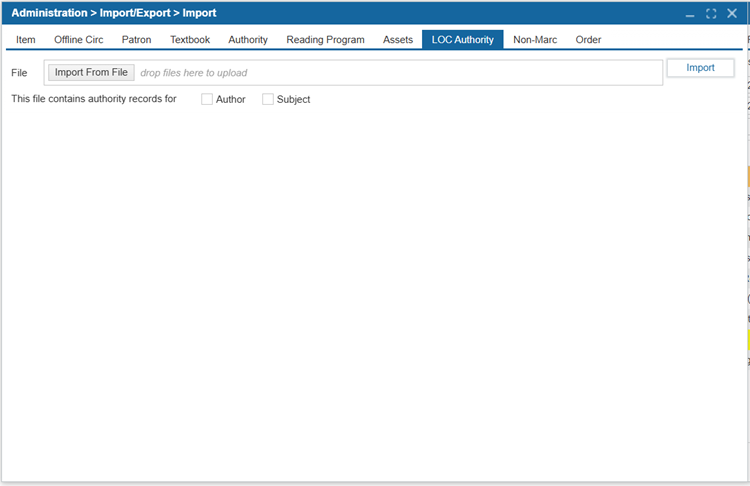 - Select Administration > Import/Export > Import > LOC Authority tab.