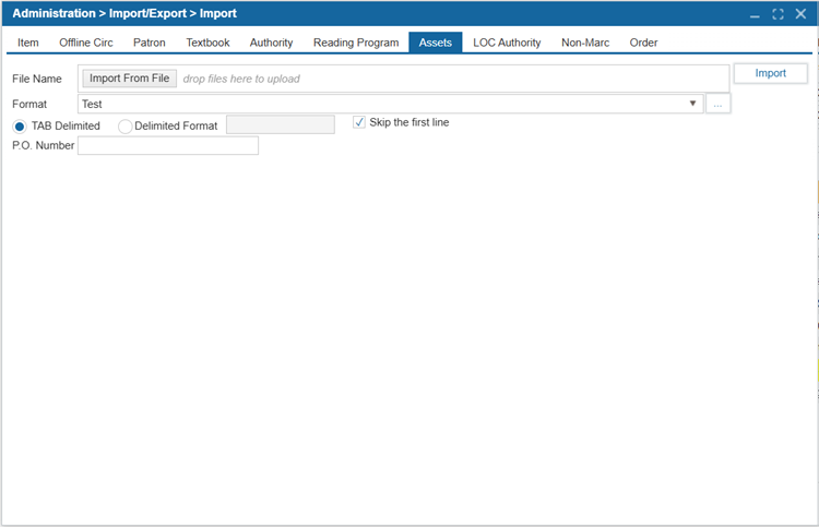 - Entering the P.O. Number allows the user to add the purchase order number for the imported assets, which will be included in the asset’s title record under the Asset > Additional Copy Info tab.