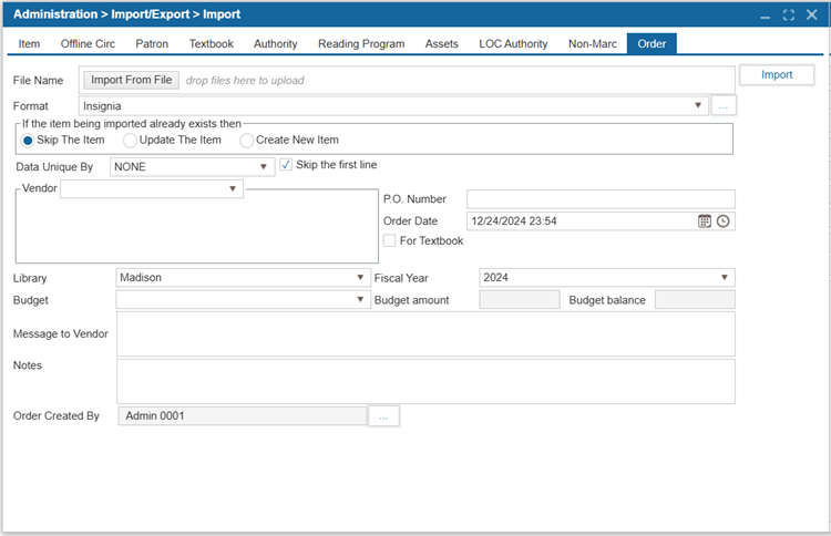 - In the Order Created By field, select the person who created the order. By default, it shows the patron who logged into Insignia and imported the records. Use the ... button to find a different patron if needed.