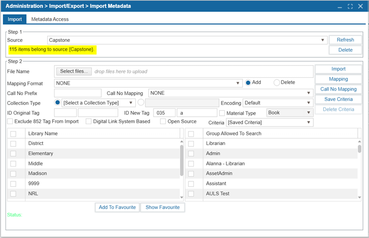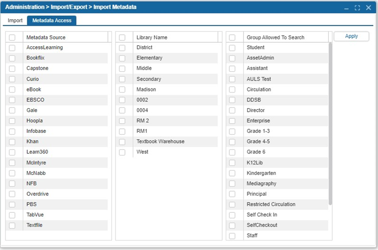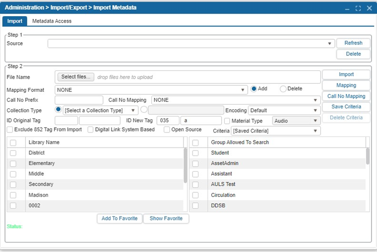 - Navigate to Administration > Import/Export > Import Metadata > Metadata Access.