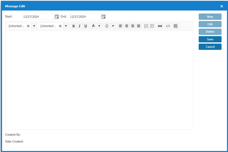 The Message window allows the user to Create and Edit messages that appear on the Discovery Layer for a fixed length of time. Messages show at the top of the Home Page under the Search box. To view messages that have expired, Select Include Expired.