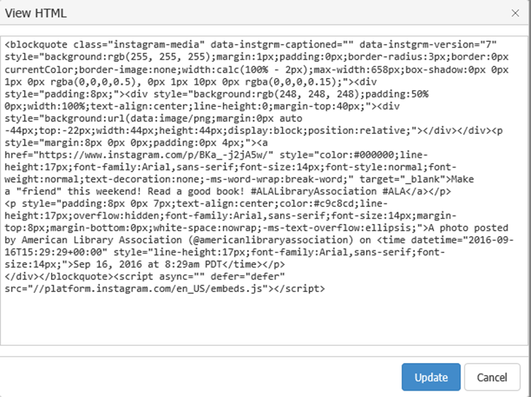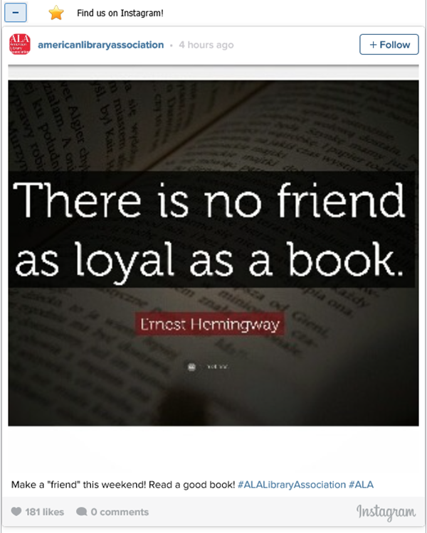 - Navigate to your Instagram Page (e.g. https://www.instagram.com/americanlibraryassociation).