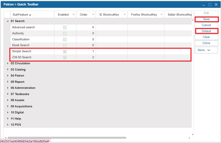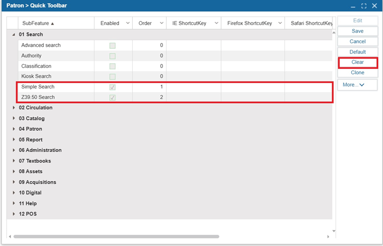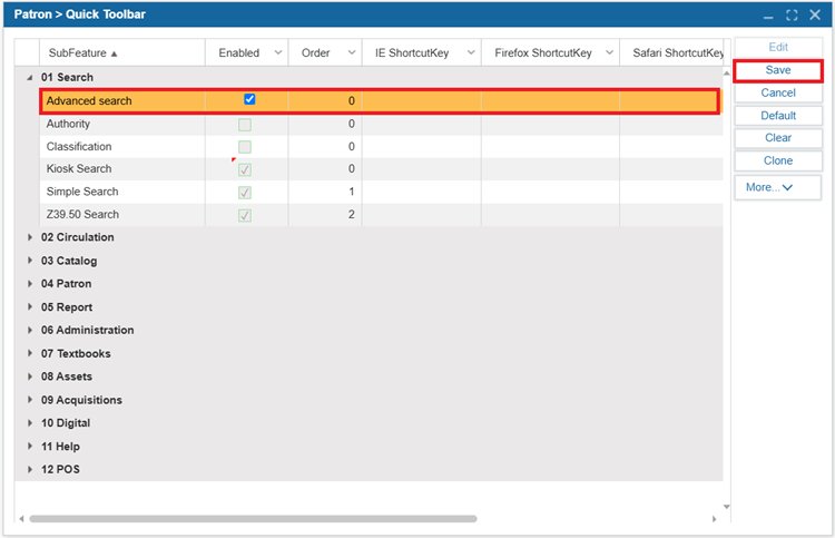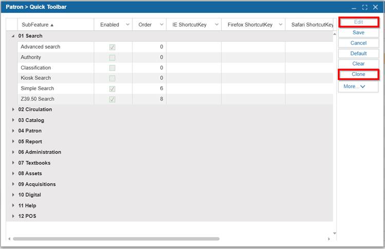 To add a feature to the quick toolbar, select the Enabled checkbox.