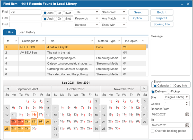 | Override Booking Period (checkbox) | This checkbox allows staff to bypass the normal booking loan period. To use it, the user must first check this box, then select the required dates using the Request From and To fields, and finally select Book It to book the item for the entered date range. |