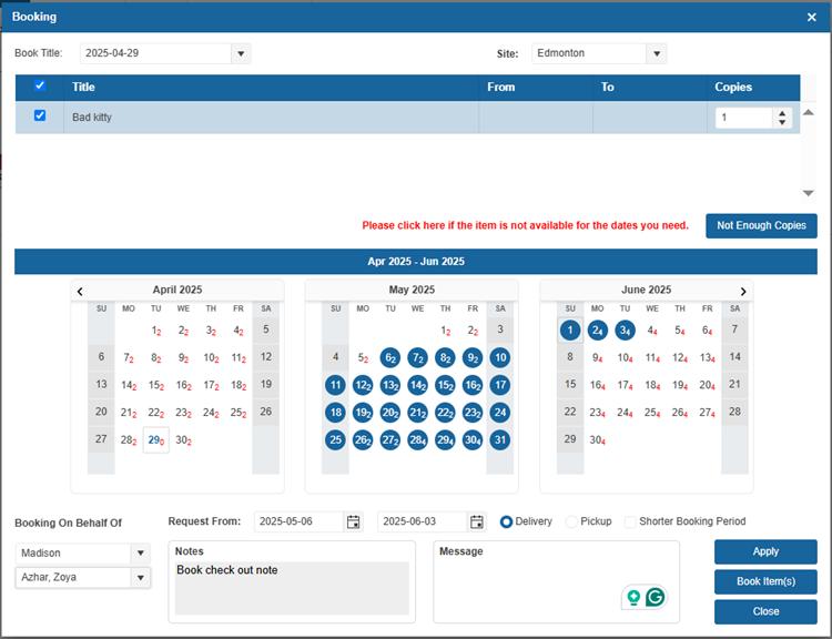 | Not Enough Copies | It allows patrons to report if there are not enough available copies for the dates they selected. When clicked, the patron is prompted to confirm their requested dates. These reports are recorded and can be reviewed in the Booking Refusals or Turn Away Statistics report under Reports > Reports. |