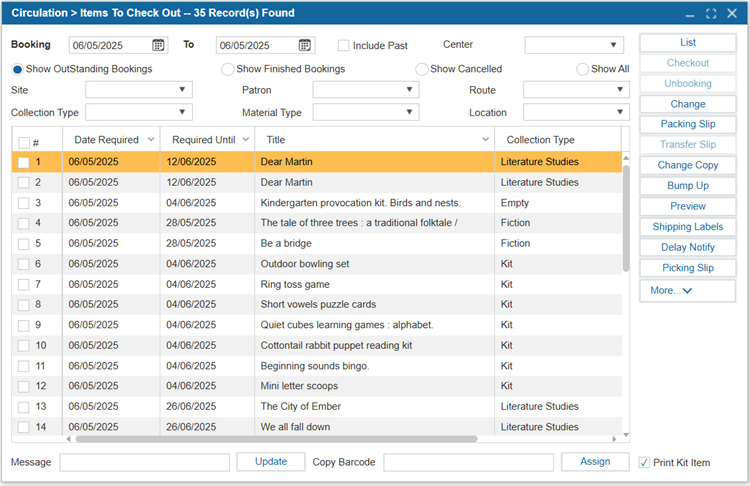 | Additional Refinement Filters | If necessary, specify additional refinement options including Site, Patron, Route, and Collection Type. 1. Center: Filters bookings made by the selected Resource Center. This is used in districts with multiple Resource Centers to view and manage bookings created by a specific center. 2. Site: Filters bookings by site. Sites can be added under Patron > Find/Add Sites window. 3. Collection Type: Filters bookings by collection type. 4. Patron: Filters bookings made by a specific patron. 5. Material Type: Filters bookings based on the type of material. 6. Route: Filters bookings based on the delivery route. 7. Location: Filters bookings based on specific copy location in the Resource Center. |