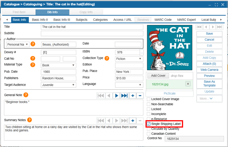 - The "Single Shipping Label" checkbox is located in the Find/Add Item window under Catalog > Cataloging > Find/Add Item > Bib Info > Basic Info tab, If the library is using the 4"x2" (Item) Shipping Label Layout, selecting the "Single Shipping Label" checkbox will ensure only one label is printed for a title, even if multiple copies are booked for the same patron.