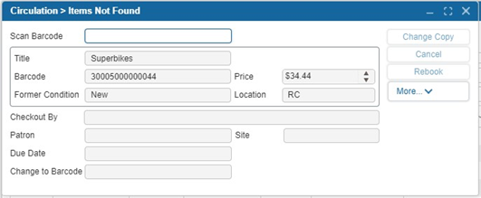 The Items Not Found window is used along with the Picking Slip to assign a different copy of the same item or to rebook an item that could not be located at the Resource Center.