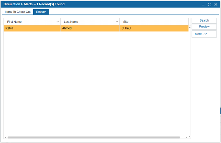 Note: For the Rebook tab to appear under the Circulation > Alerts window, the Security Setting "Rebook" must be enabled. This can be done by navigating to Administration > Security > Circulation > Alerts and enabling the setting for the Patron Group responsible for handling rebookings.
