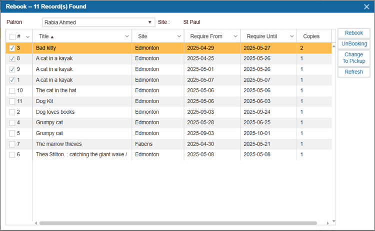 This feature is used when a patron’s site has changed since they originally booked items. The system helps update the booking so it matches the patron’s new site.