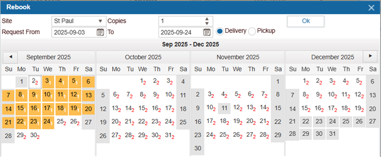 | Delivery/Pickup (radio buttons) | Use this option to select how the booked item will be received. Delivery requests the item to be sent to a chosen site, while Pickup means the patron will pick up the item directly from the library. |