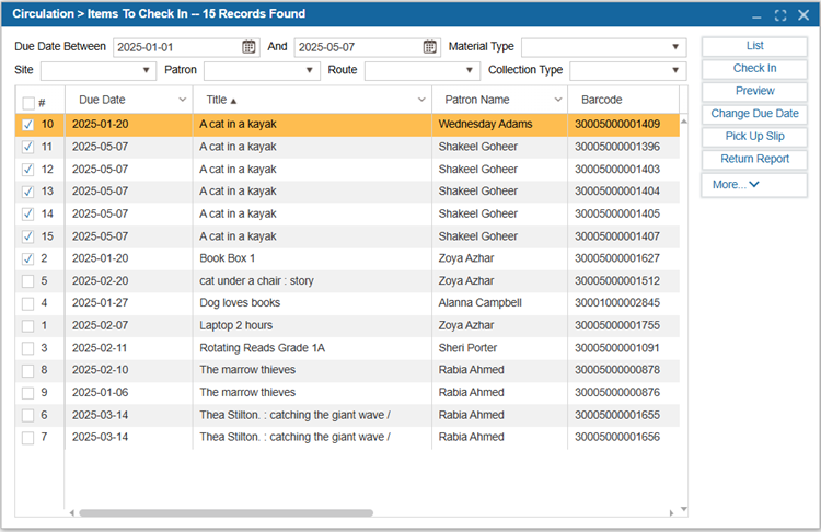 The Items To Check In window provides library staff with a convenient way to view, filter, and process the return of multiple items that are due within a selected date range.