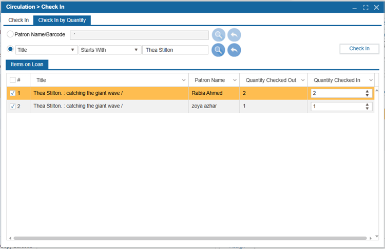 The Check In By Quantity tab allows staff to check in multiple copies of an item borrowed by a patron without having to scan each barcode individually. This simplifies and speeds up the process for bulk returns.